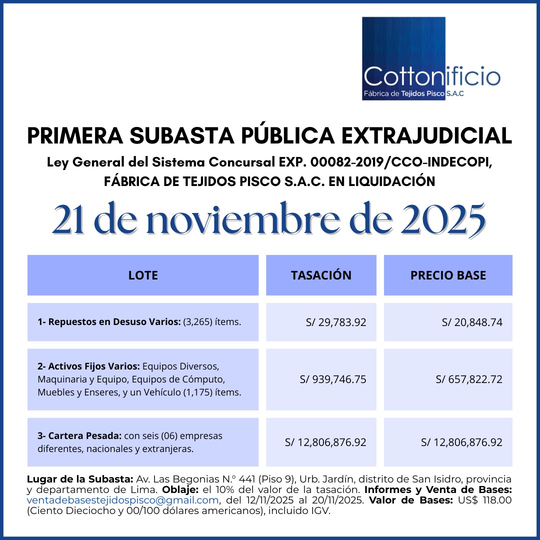 BIENES FÁBRICA DE TEJIDOS PISCO S.A.C. *SEGUNDA SUBASTA PRESENCIAL*